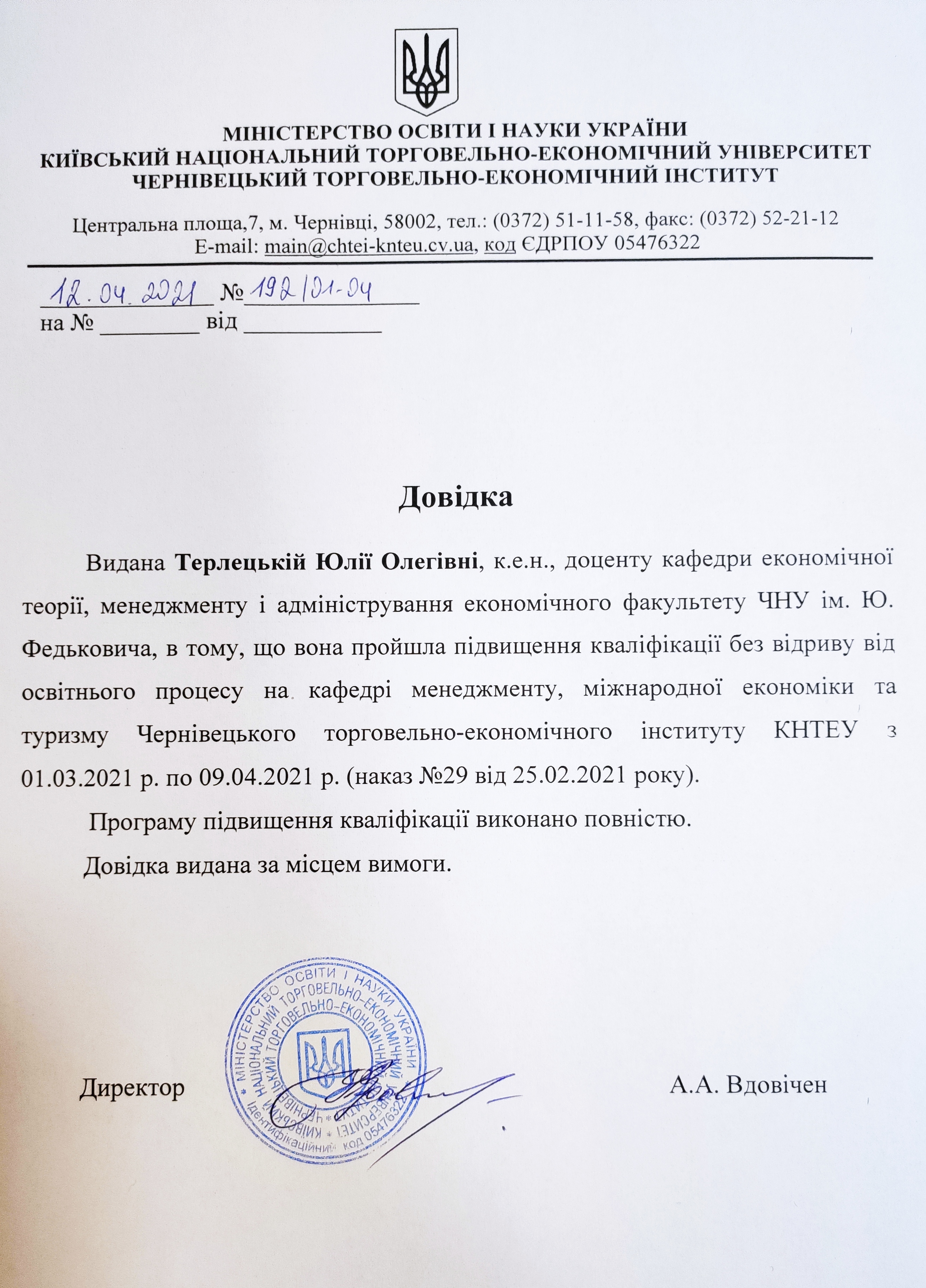 1. Чернівецький торговельно-економічний інститут Київського національного торговельно-економічного університету, кафедра менеджменту, міжнародної економіки та туризму (Довідка про підвищення кваліфікації 192/01-04 від 12.04.2021 р.) Тема: «Удосконалення інноваційної діяльності підприємств та систем управління якістю в умовах невизначеності зовнішнього середовища» (180 годин / 6 кредитів) https://ecoman.chnu.edu.ua/media/awldwh4g/dovidka-pro-stazhuvannia.jpg