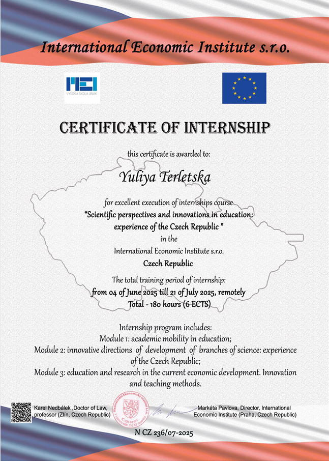 2. Міжнародне науково-педагогічне стажування «SCIENTIFIC PERSPECTIVES AND INNOVATIONS IN EDUCATION: EXPERIENCE OF THE CZECH REPUBLIC» у Міжнародному економічному інституті (м. Есеніце, Чехія, 04.06.2025 р. – 21.07.2025 р.), 180 годин / 6 кредитів. Сертифікат № CZ 236 / 07-2025 https://ecoman.chnu.edu.ua/media/gicptmpe/sertyfikat-pro-mizhnarodne-naukovo-pedahohichne-stazhuvannia.png